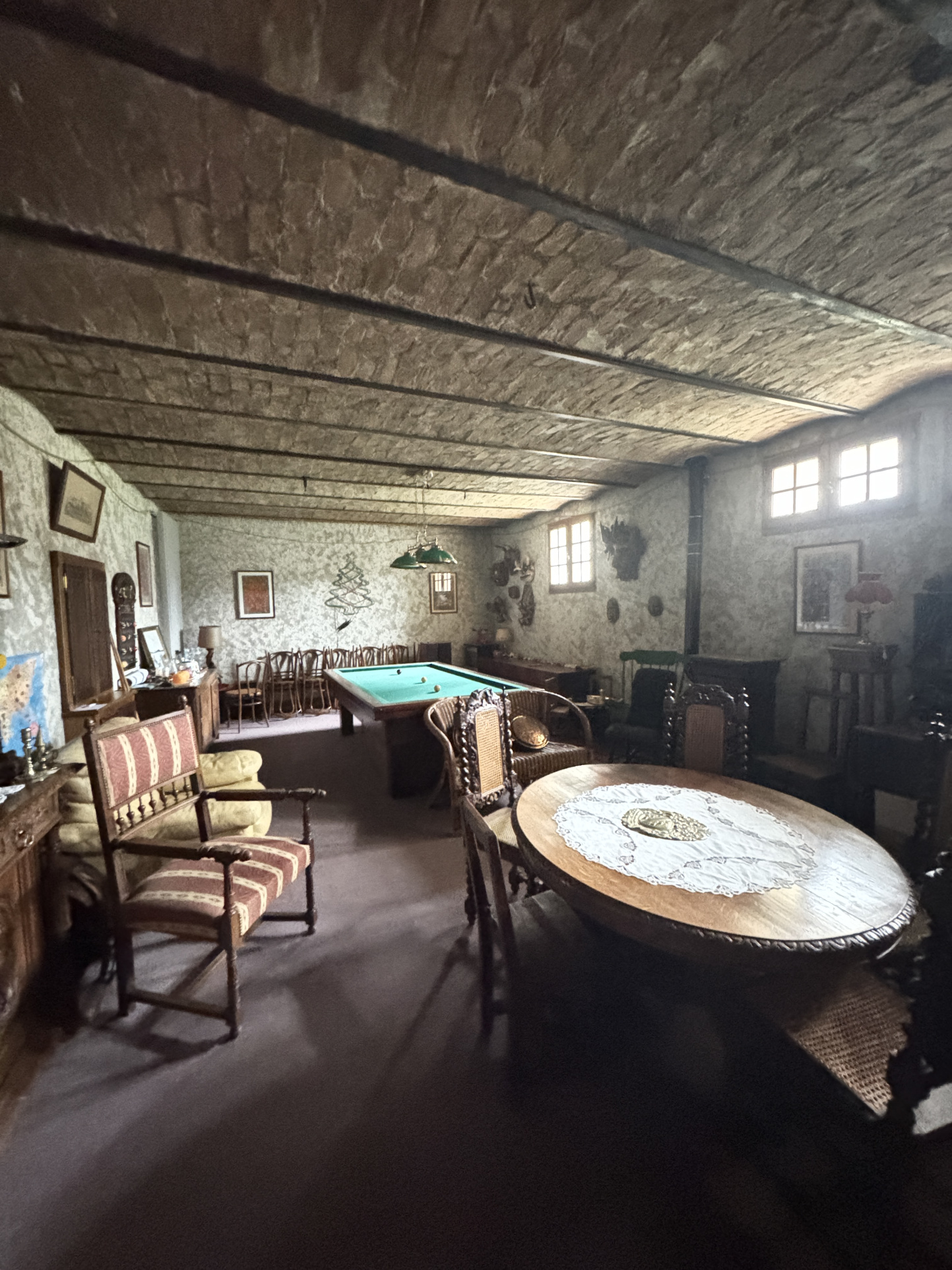 Une buanderie/chaufferie, via un dégagement, une salle de douche, avec point d'eau/lavabo séparé, un grand bureau, et un accès direct sur une grande salle de convivialité (billards/soirées festives).